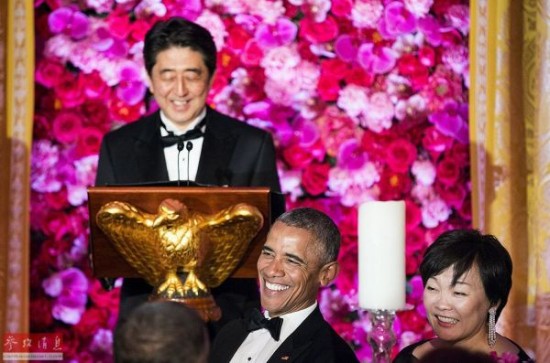 4月28日,美国华盛顿,美国白宫设国宴款待到访的日本首相安倍晋三和夫人安倍昭惠,美国总统奥巴马与夫人米歇尔陪同。图为在晚宴期间奥巴马在听安倍晋三致辞。
