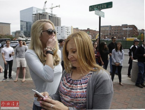 5月15日,在位于美国波士顿的莫克利联邦法院门口,人们通过手机收到波士顿马拉松爆炸案嫌疑人被判死刑的消息。