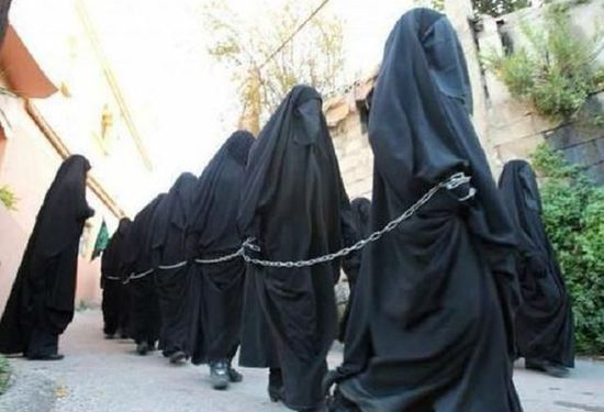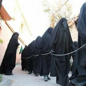 资料图片:“伊斯兰国”强迫被俘女性戴面纱,用铁链捆绑贩卖。(图片来源于网络)