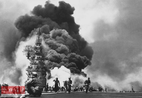 资料图片:冲绳战役期间,美军“邦克山”号遭神风自杀攻击机重创。