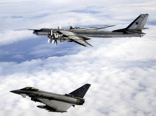 资料图片:英军“台风”战斗机拦截俄军图-95轰炸机。(图片来源于网络)