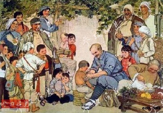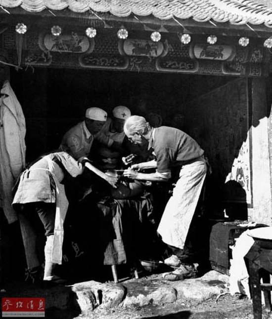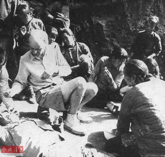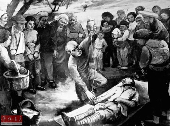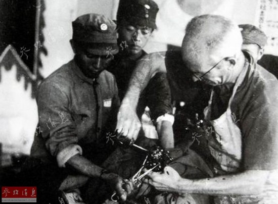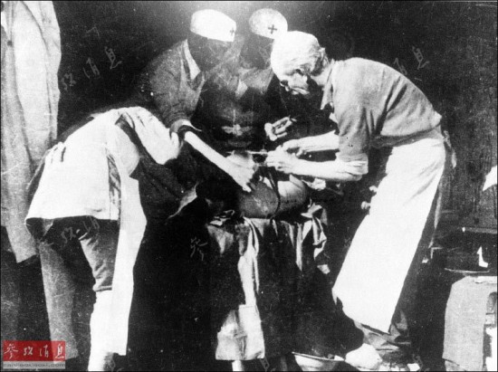 白求恩在中国士兵帮助下,从伤员身上取出弹片。