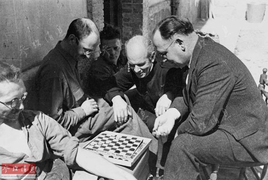 图为1937年,白求恩(右起第二人))在闲暇时,与同事一同玩棋类游戏。