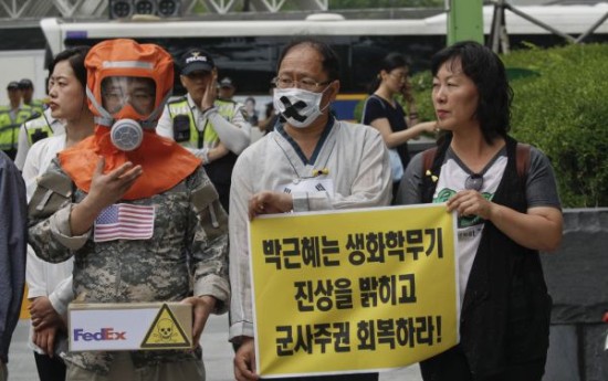 资料图片:韩国民众就美军误送炭疽杆菌样本事件进行示威抗议。(图片来源于网络)