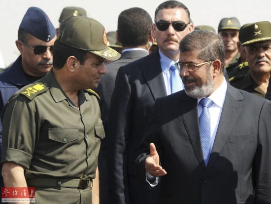 这是2012年10月10日,时任埃及总统穆尔西在埃及伊斯梅利亚省视察装甲部队时和时任国防部长塞西交谈的资料照片。新华社/路透