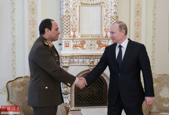 这是2014年2月13日,时任埃及国防部长的塞西(左)在俄罗斯莫斯科与俄罗斯总统普京握手的资料照片。新华社/法新