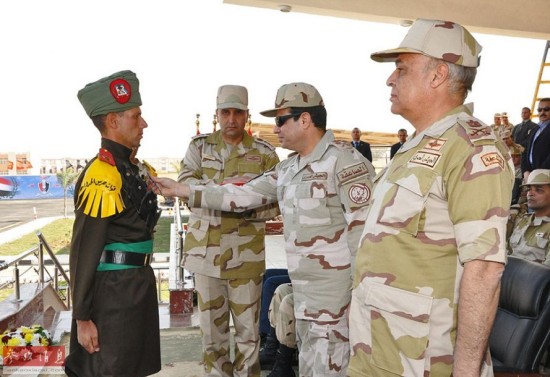 这是2013年12月26日,塞西(右二)在埃及开罗为一名边防守卫人员授勋的资料照片。新华社/法新