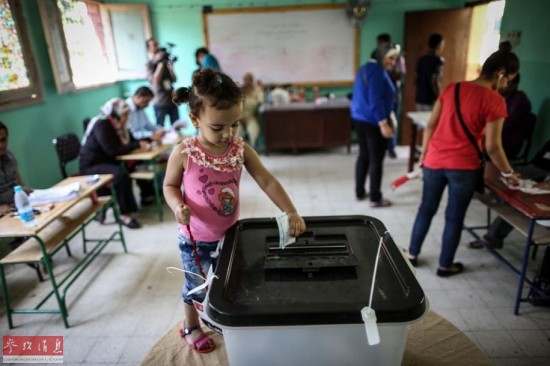 5月27日,埃及首都开罗,在总统选举第二天,一名孩子在投票箱旁玩耍。