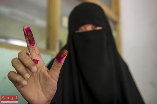 5月27日,埃及首都开罗,在总统选举第二天,一名蒙面的妇女在投完票后展示蘸过墨水的手指。