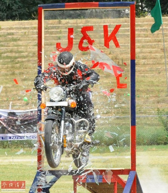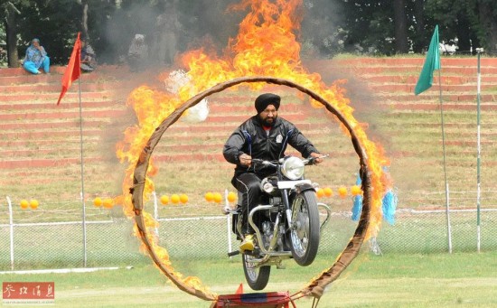当地时间8月15日,印度克什米尔地区警察骑摩托车表演特技,庆祝独立日的到来。