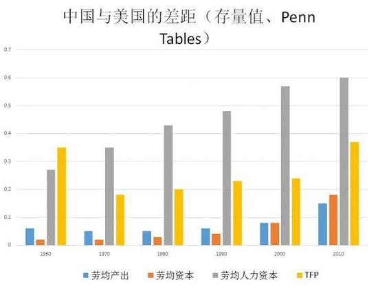 张军利用美国宾州大学的著名的数据库“佩恩表”计算了中国与美国,在多个衡量经济发展的水平值上的差距,发现中国目前的人均收入、人均资本和劳动生产率与美国的差距,大概仅相当于韩国的80年代、日本的60年代后期与当时美国的差距。