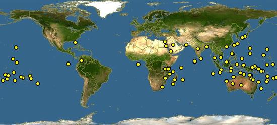 砗磲分布图近年来,随着国内外对砗磲产品的需求日趋旺盛,滥捕偷采现象极为严重,造成砗磲自然资源急剧下降,甚至面临枯竭的窘境。