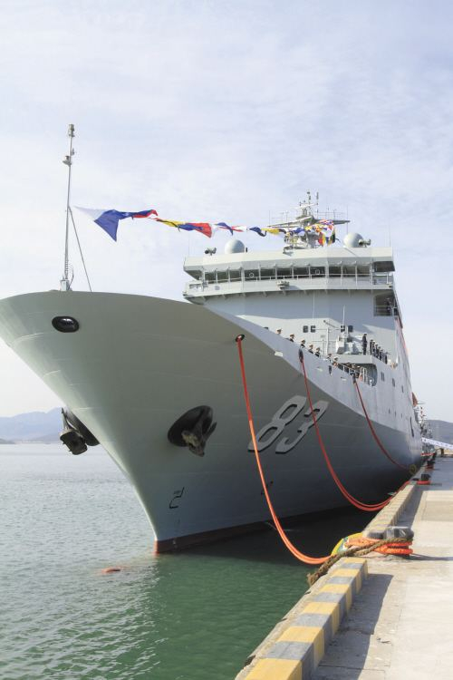 戚继光舰舷号“83”21日,以民族英雄戚继光命名的某新型训练舰入列命名仪式在大连旅顺某军港举行。