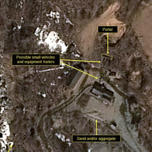 最新卫星图片显示,丰溪里核试场坑道口有疑似拖车。“北纬38度”25日称,24日拍摄到的卫星图片显示,丰溪里核试场北端入口处出现四五件拖车样物体,有可能是用来运送实验设备甚至核装置的。入口旁边还有一堆砂石,可能是用来制作封堵物,防止核物质泄漏到空气之中。
