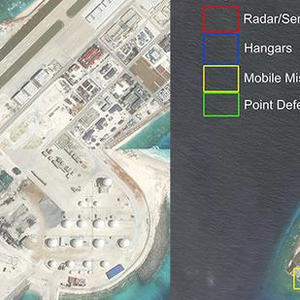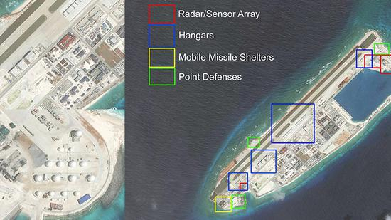 该组织还称,中国一年多前已在永兴岛部署红旗9号地对空飞弹,也至少在一处部署反舰导弹;也在永暑礁、渚碧礁和美济礁上为移动式导弹发射器建成开合式掩护设施;还在永暑礁上建成可容纳24架战机、3架包括大型轰炸机在内的大型飞机的机库。