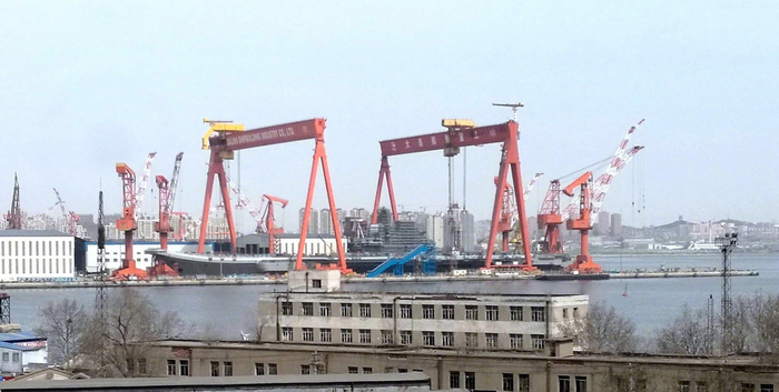 国产航母未下水前的照片,请注意照片上两台千吨级龙门吊,虽然这样的设备在国内船厂并不稀奇,但确实是为辽宁号的改装和国产航母的建设做出了巨大的贡献,包括辽宁号当年在改装时舰桥整体起吊也是由这两台龙门吊协力完成