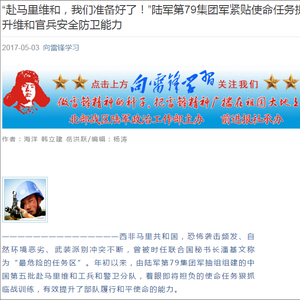 另据微信公众号“向雷锋学习”今年4月28日的报道介绍,由北部战区陆军雷锋生前所在部队为主组建的中国第五批赴马里维和工兵分队,即将在今年5月中旬赴西非马里执行为期1年的维和任务。
