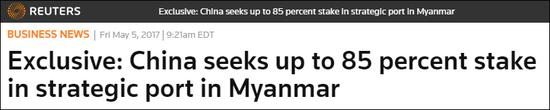“中国试图在缅甸战略港口占股85%”,截图来自路透社路透社称,缅甸政府在皎漂港交易中似乎处于十分被动的位置。据两名缅甸政府决策消息人士称,中信集团在谈判中具有主导地位,缅甸只能在中信集团的四个建议中选一个,但不论选哪一个,最终对皎漂港的控制权都不会超过30%。缅方担心这会让中方对港口有绝对控制权,但碍于财政问题,缅甸相信别无选择。消息人士还称,缅甸政府与中信集团将按股权比例进行融资。