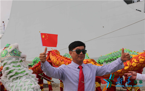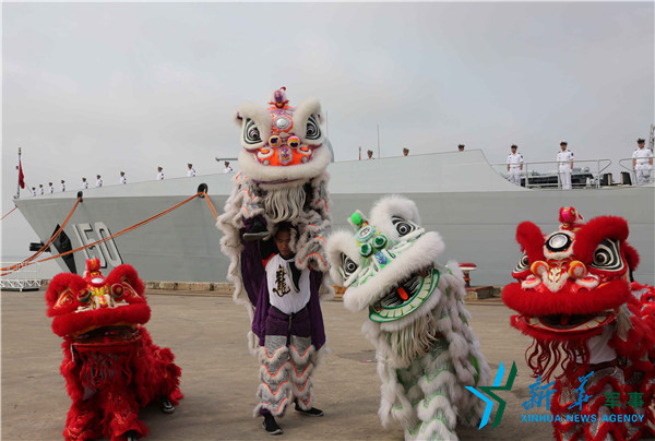 当地时间18日上午8时30分,中国海军远航访问编队抵达缅甸迪洛瓦港码头。图为华人华侨以舞狮的方式迎接访问官兵。新华社记者许寿明 摄