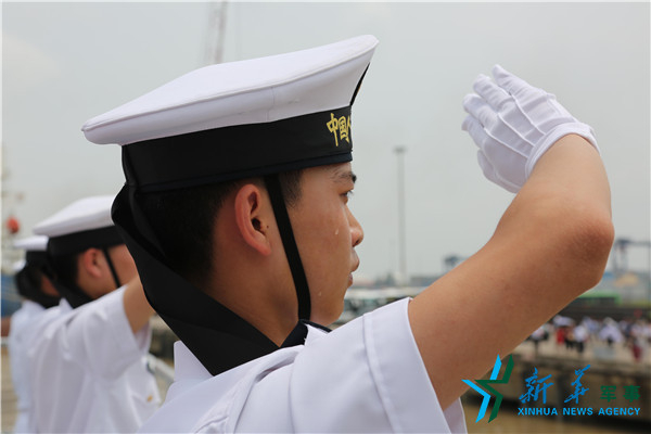 当地时间21日11时,中国海军远航访问编队离开缅甸仰光迪洛瓦港码头时,水兵向送行民众挥手告别。新华社记者许寿明 摄