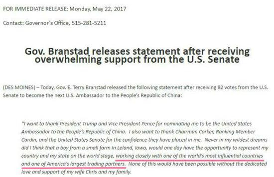 在得知自己的大使提名已经被参议院投票批准后,布兰斯塔德22日当天发表了一份声明。他说,中国是世界上最有影响力的国家之一,也是美国最大的贸易伙伴之一。他期待为实现两国互惠互利而努力。