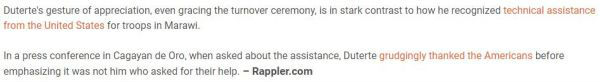 与杜特尔特此次对中国的“再三道谢”形成鲜明对比的是,他对美国向菲律宾军队“提供技术支持”一事反应冷淡。当被媒体问及此事时,杜特尔特才“很不情愿地”对美方表示感谢,但同时称,他本人“并没有要求美国提供这些帮助”。