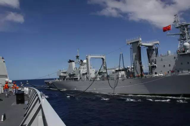远洋过程中,中方编队进行多次演练,图为骆马湖舰为合肥舰补给
