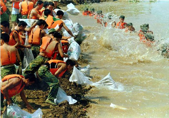 湖北石首久合垸乡团山河支堤出现“管涌”险情,解放军官兵立即奔赴险段,以血肉之躯挡住肆虐的洪水,降低洪水的冲击力,同时加固堤防(1998年8月11日摄)。 新华社记者 李刚摄