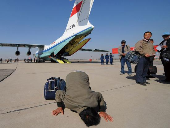 空军4架运输机接运我在利比亚人员安全抵京,受困同胞亲吻祖国大地(2011年3月4日摄)。 新华社发(张东贺 摄)