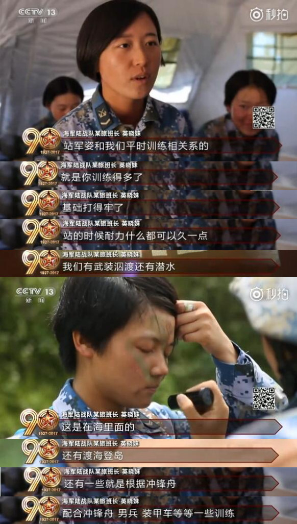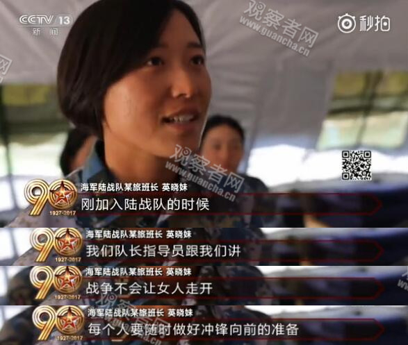 海军陆战队某旅班长英晓妹在接受采访时提到,刚加入陆战队时,队长指导员曾对她们讲,战争不会让女人走开,每个人要随时做好冲锋向前的准备。