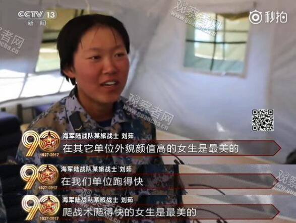 另一位海军陆战队战士表示,在其他单位外貌颜值高的女生是最美的,在这里,跑得快,爬战术爬得快的女生是最美的。