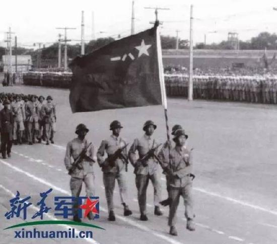 开国大典上,步兵师冲锋枪方队走过广场,八一军旗第一次正式亮相。