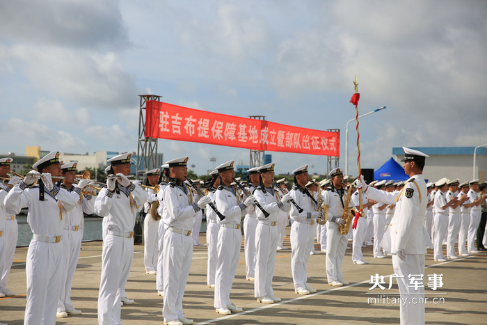 中国人民解放军驻吉布提保障基地于今年7月11日成立,海军在广东湛江某军港码头举行了基地成立暨部队出征仪式,基地官兵乘海军井冈山舰、东海岛船航渡至吉布提。