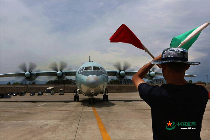 8月9日13时16分,执行航空侦察任务的西部战区空军运-9飞机返回四川某军用机场。