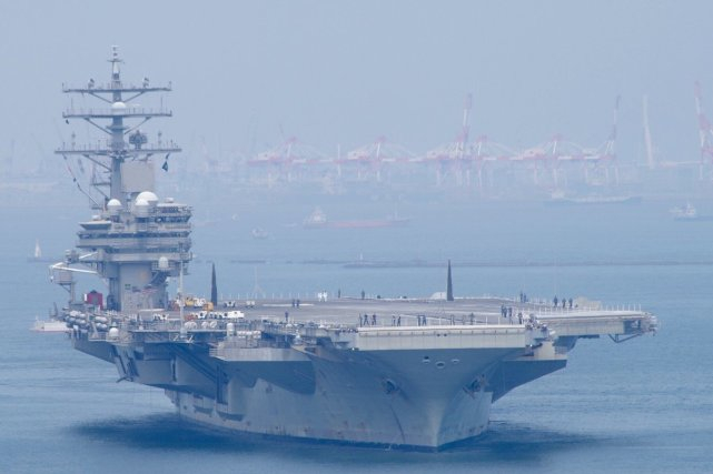 2017年8月9日,美国海军的核动力航母“里根”号和日本海上自卫队的“出云”号直升机航母都已经返回横须贺的港口,就像是两者之前都已经约定好了的一样。图为正在入港的“里根”号航母,甲板上没有一架舰载机,全部都收到机库里面去了。