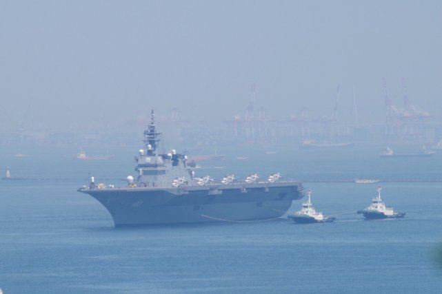 图为“出云”号航母的正面特写。这艘战舰是日本海上自卫队最大的战舰之一,满载排水量2.7万吨。“出云”号总共可以携带28架直升机,但标配通常是14架直升机,其中7架为SH-60K反潜直升机,另外7架是MCH-101型扫雷直升机。