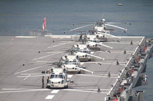 正在靠港的“出云”号直升机航母。按照日本海上自卫队最初的要求,“出云”级直升机航母仅搭载7架SH-60K反潜直升机和2架搜救直升机。不过,最近的配置已经发生了很大的变化。除了用于反潜和扫雷之外,“出云”号也可以当作运输舰使用,能搭载400名自卫队员和50台3.5吨的卡车。