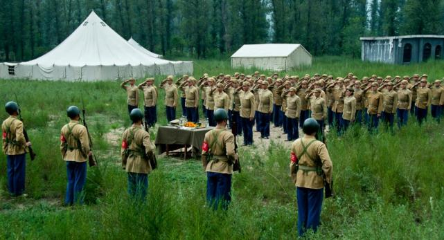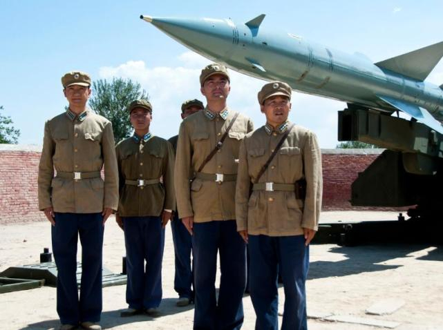 图片:《绝密543》剧照,演员们笔直的军姿显示出该片的严肃性。其后是苏制萨姆-2中远程地空导弹。