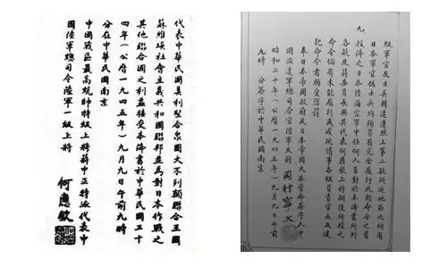 1945年9月9日,日本向中国递交投降书,图为何应钦签字(左)及冈村宁次签字。(资料图)因为珍爱和平,我们回首这场战争!祭奠同胞,传播真相,为曾经的屈辱,为不屈的抗争,更为长鸣的警钟。
