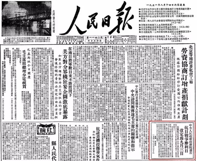 1951年8月13日,政务院发布通告,将抗战胜利纪念日改定为9月3日。