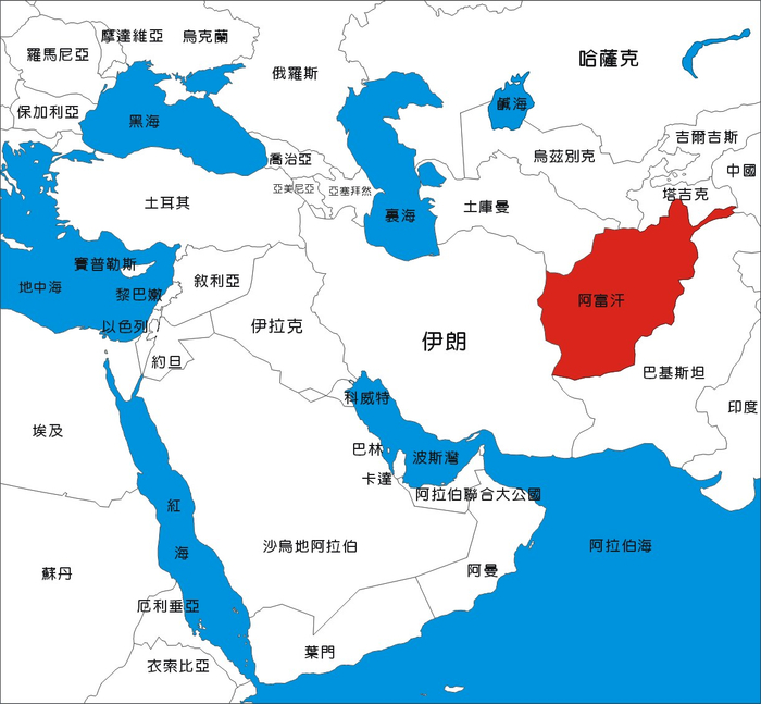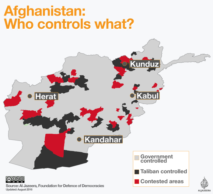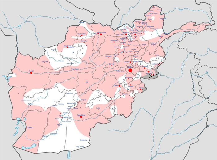 上图为2017年2月阿富汗形势图。粉色为政府军控制区域,白色为塔利班控制区域,黑色为ISIL控制区域。实际上粉色白色区域有很多是双方争夺的对象。