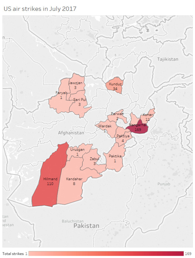 上图为近期美军在阿富汗空袭图,最多的在ISIL组织的楠格哈尔省,其次就是塔利班盘踞的赫尔曼德省和坎大哈省。但美军的空袭,对塔利班的效果并不显著。