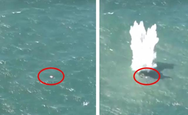 我们首先来看看,玄武2B和玄武2C的命中精度,高得吓人。在这张攻击海上标靶的对比图中,左边红圈内有一个小小的浮标,右边显示玄武2C导弹命中瞬间,距标靶只有几米的距离。对于弹道导弹来说,这已经是非常出色的成绩。