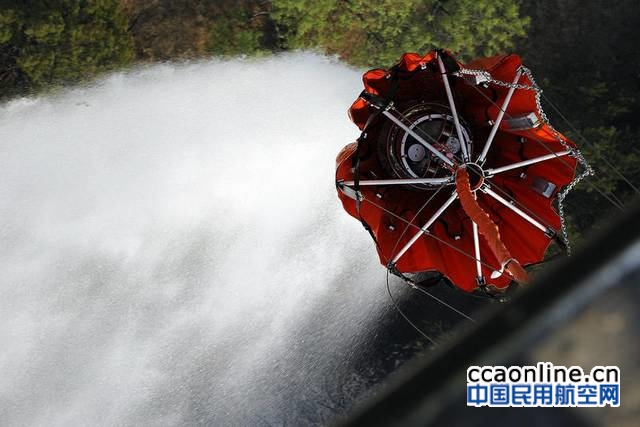 当天上午,AC313直升机城市消防型起飞至10m高度悬停,完成水炮炮管角度控制及吸水软管放出、收起功能验证后,直升机飞至水池上方,缓慢下降至4m高度悬停,完成吸水后平飞至喷水点。操作员将水炮系统的空气选择开关置于“OFF”位,水从炮管喷涌而出,直升机前方出现一道“最美的弧线”,AC313直升机城市消防型空中喷水试飞科目圆满完成。