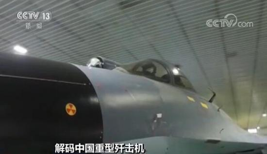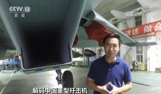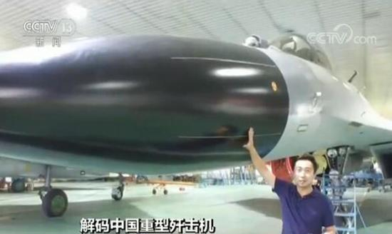 央视记者吴杰:这里是航空工业沈飞的试飞站机库,在我身后,就是我们国家自主研制的重型歼击机歼11B,它的最大起飞重量可以达到三十吨左右,可以说是一架名副其实的空中巨鹰。