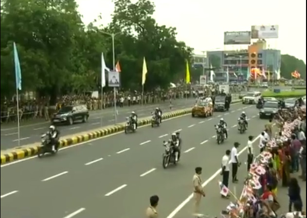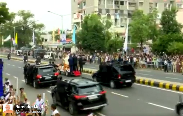 据报道,安倍抵达印度时身着西装,而在登上吉普车与莫迪一起观赏“路演”之前,安倍特意换上一件印度传统服饰库尔塔(kurta),并罩以蓝色背心。此前据艾哈迈达巴德市政府常务委员会主席帕特尔(PravinPatel)介绍,包括歌唱团在内的大量人群会在沿路的28处地点表演,欢迎莫迪和安倍。“路演也会经过萨巴玛蒂河畔,我们在整体路线中搭建了28处小舞台,届时将有来自各邦的身着传统盛装的舞者,在领导人经过时进行表演。”