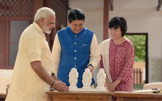 据《今日印度》报道,“三不猴”在日本是著名的文化形象,三只猴子一只捂耳、一只掩嘴、一只蒙眼,表示“不听、不看、不说”。甘地也曾收藏一座“三不猴”雕塑,其复制品目前陈列在甘地纪念馆。在安倍抵达印度当天,艾哈迈达巴德为安倍准备了长达8公里的沿路欢迎表演,起点位于艾哈迈达巴德机场,终点就在甘地纪念馆。