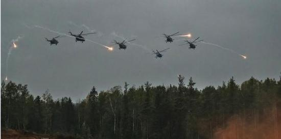 在俄白“西方-2017”联合军演中,米-8直升机为部队提供火力掩护。(俄罗斯《消息报》网站)参考消息网9月21日报道 塔斯社9月19日发表题为《“西方-2017”演习:检验俄军“神经系统”》的报道称,“西方-2017”联合战略演习是对俄罗斯和白俄罗斯军队所有指挥机构和部队的一次大考,从排到军,从士兵到将军。