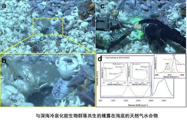 通过“发现”号无人潜水器携带的深海激光拉曼光谱探针,科考团队在我国南海约1100米的深海海底,探测到两个站点存在裸露在海底的天然气水合物,这也是科学家在我国南海海域首次发现裸露在海底的“可燃冰”。