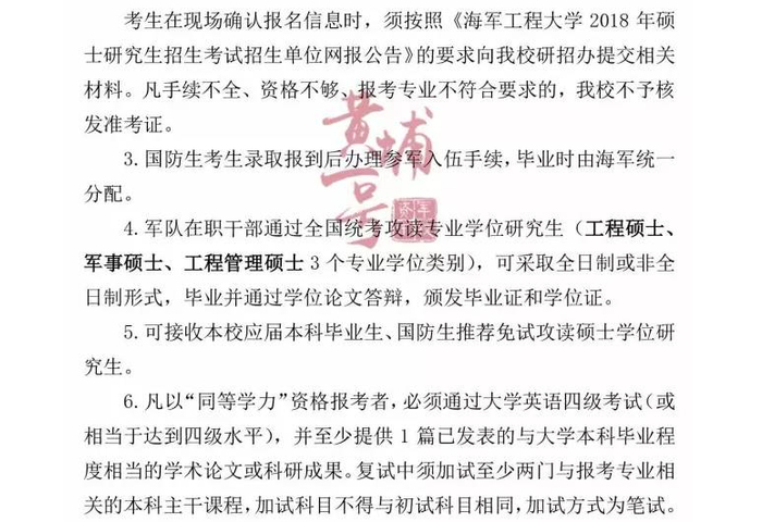 招收对象:军校应届本科毕业生、军队在职人员、普通高校应届本科国防生三类人员报考。